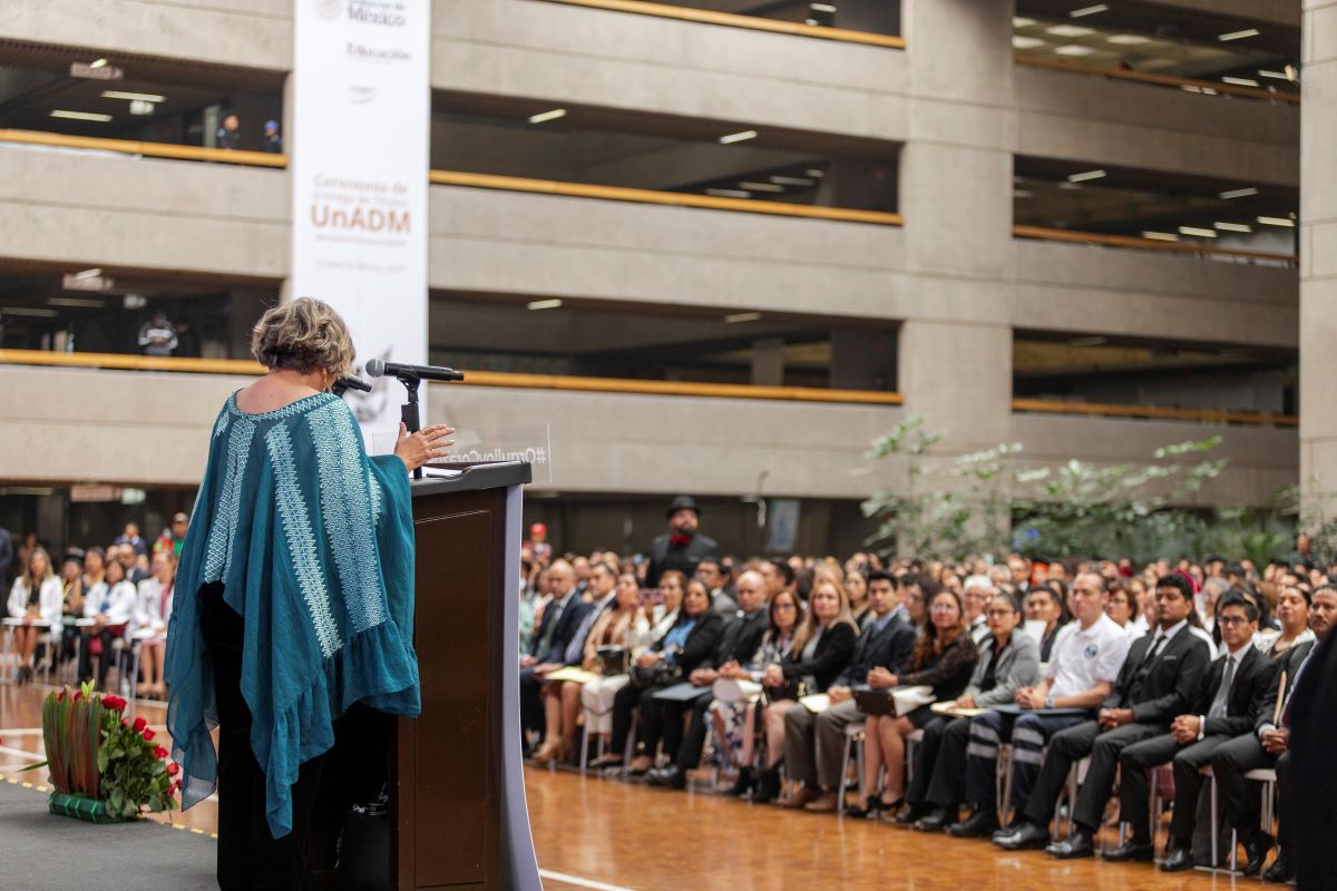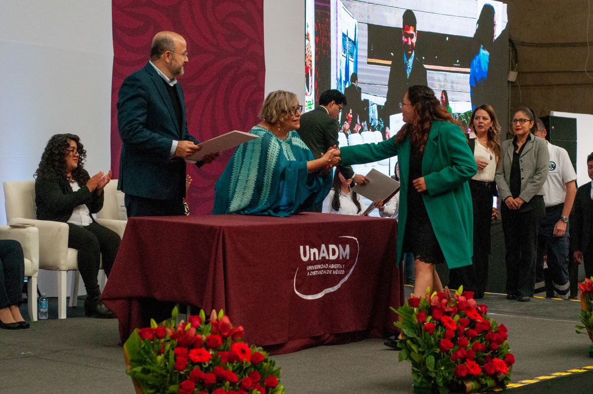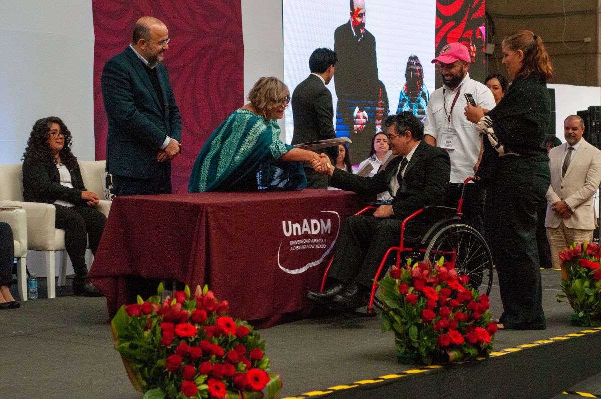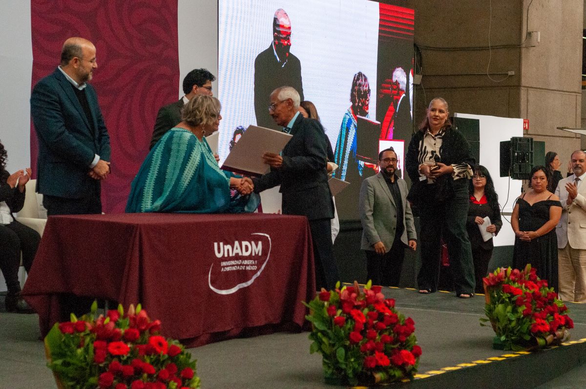 La emoción creció aún más cuando se proyectó un segundo video, esta vez con un tono más histórico y expansivo. En él se recordó cómo, desde su origen como programa piloto en 2008, hasta su consolidación como universidad formalmente constituida, la UnADM se ha guiado por los principios de inclusión, apertura y flexibilidad. El material destacó su matrícula actual, que supera los 120 000 estudiantes, —la mitad de ellos mujeres— y más de 20 000 egresadas y egresados También se presentaron algunas de sus iniciativas más recientes: el proyecto UnADM Saludable, las certificaciones para el trabajo a distancia, 100 Técnicas Didácticas y los pódcast realizados junto con el Instituto Mexicano de la Radio, que ya suman más de 100 000 reproducciones. Todo con un mensaje claro: la UnADM no solo forma profesionistas, sino agentes de cambio.